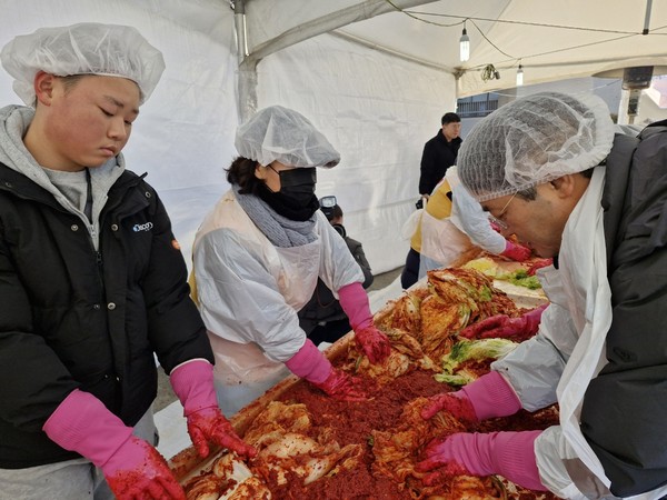 [뉴스인] 조진성 기자 = 지난 14일 미주총연 한국지부와 고양시청이 함께한 ‘사랑의 김장 나눔’ 행사에서 경민중학교 2학년 최승민 군(사진 왼쪽)이 김장을 하고 있다.
