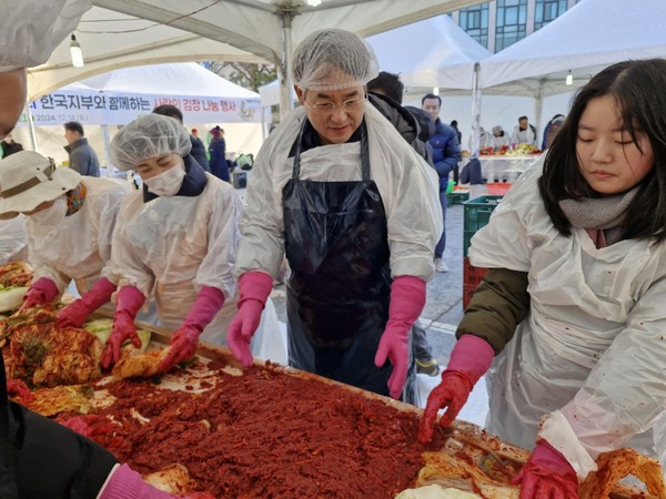 [뉴스인] 조진성 기자 = 지난 14일 미주총연 한국지부와 고양시청이 함께한 ‘사랑의 김장 나눔’ 행사에서 송추 초등학교 6학년 최민서 양(사진 오른쪽)이 이동환 고양시장(사진 가운데)과 함께 김장을 하고 있다.