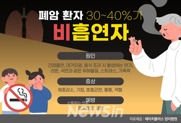 [뉴스인] 민경찬 기자 = 폐암은 국내뿐만 아니라 전 세계적으로 사망률 1위인 무서운 질병이다. 폐암의 원인은 흡연이 가장 크지만 담배를 전혀 피우지 않는 비흡연자도 폐암에 걸린 사례가 늘고 있어 주의해야 한다. 대한폐암학회가 최근 발간한 비흡연인 폐암 정보를 보면 비흡연인 폐암은 평생 담배를 입에 대지 않았거나 100개 미만의 담배를 피운 사람에 해당하는 것으로 폐암 환자 중 비흡연인 비율은 약 30~40%로 알려졌다.