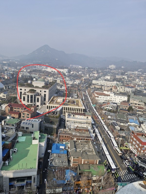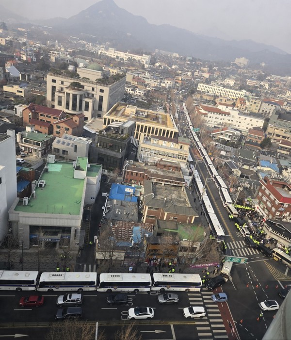 [뉴스인] 조진성 기자 = 구속 수감 중인 윤석열 대통령이 21일 오후 2시 열리는 헌법재판소 탄핵심판에 직접 출석한 가운데 서울 종로구 헌법재판소 인근이 경찰 버스 차벽으로 둘러싸여 있다.