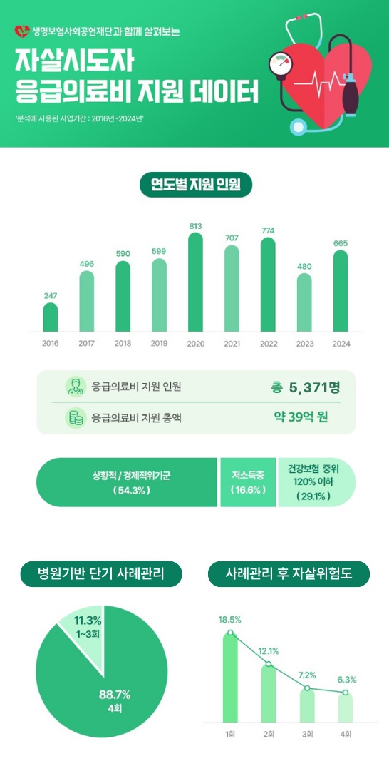 생명보험사회공헌재단(이사장 이장우, 이하 생명보험재단)은 자살시도자 응급 의료비 지원 사업을 통해 2016년부터 지난 9년간 총 5,371명의 자살시도자에게 약 39억 원의 치료비를 지원했다. 경제적 어려움으로 적절한 치료를 받지 못하는 취약계층 자살시도자에게 실질적인 도움을 제공하며, 고위험군 관리를 강화해 자살 재시도 예방과 사회 안전망 구축에 기여하고 있다.