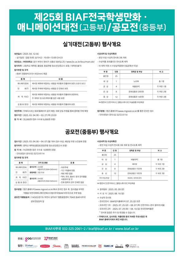 애니메이션과 만화, 웹툰계의 무한 가능성을 보일 청소년들의 기회를 제공하고자 협찬사 신한커머스와 클립스튜디오의 참여로 더 풍성해진 제25회 BIAF전국학생만화애니메이션대전/공모전에 대한 자세한 사항은 BIAF 공식홈페이지(https://biaf.or.kr/kr) 에서 확인할 수 있다.