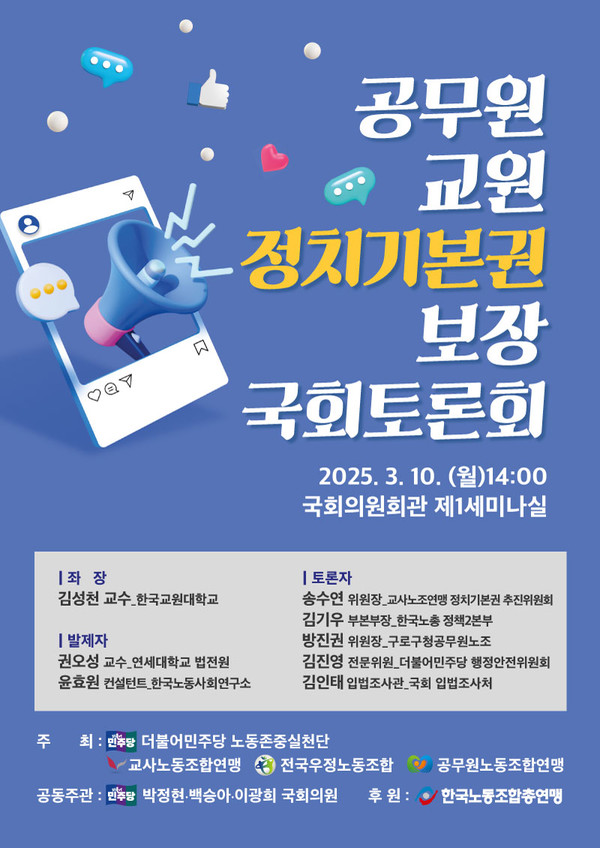 이번 국회토론회는 더불어민주당 노동존중실천단, 교사노동조합연맹, 전국우정노동조합, 공무원노동조합연맹이 공동 주최하고 박정현·백승아·이광희 국회회원이 공동 주관하고, 한국노총이 후원한다.