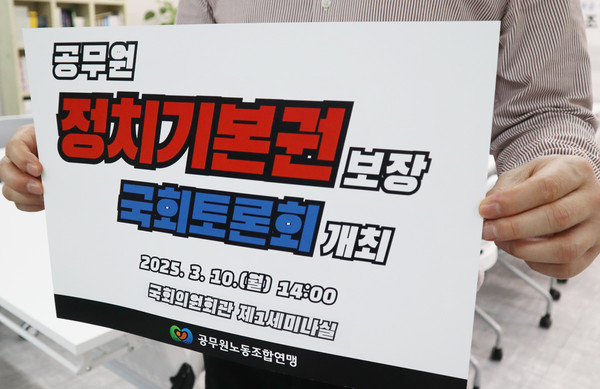 [뉴스인] 장재필 기자 = 공무원연맹(위원장 김현진)은 오는 10일 국회의원회관 제1세미나실에서 ‘공무원·교원 정치기본권 보장’국회토론회를 더불어민주당 노동존중실천국회의원단(단장 전현희 최고위원)과 교사노동조합연맹, 전국우정노동조합과 정책토론회를 개최한다.