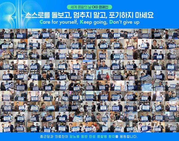 CKD 캠페인에는 전국 의료진과 종근당 임직원이 참여했으며, CKD 캠페인 메시지가 담긴 보드를 들고 사진을 촬영하며 당뇨병 환자에서 만성 콩팥병 조기 진단의 중요성을 알리고 환자들에게 응원의 마음을 전했다.