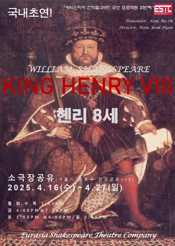 2025년부터는 영국 정치사에 새로운 획을 그은 엘리자베스 1세 여왕의 특별한 부친 이야기 <헨리8세>(Henry VIII)와 이어지는 재밌고 유쾌한 희극들 <실수연발>(The Comedy of Errors), <윈저의 즐거운 아낙네들>(Merry Wives of Windsor), <눈엔 눈, 이엔 이>(Measure for Measure) 그리고 셰익스피어의 후기 낭만극 <두 귀족 친척>(The Two Noble Kinsmen), 아름다운 감동의 가족 해후를 다룬 극 <겨울 이야기>(The Winter's Tale>, <페리클레스>(Pericles), <심벌린>(Cymbeline), 그리고 셰익스피어 최후의 역작 그 인생 대회전의 드라마 <폭풍> (The Tempest) 등 보석 같은 명작들이 공연될 예정이다, 그리고 마지막으로 셰익스피어의 주옥같은 명시들ㅡ비너스와 아도니스(Venus & Adonis), 루크리스의 능욕(The Rape of Lucrece), 슬픈 사랑의 순례자(The Passionate Pilgrim), 애인의 한탄(A Lover’s Complaint) 과 같은 서사시(The Narrative Poems)와 154편의 소네트(The Sonnets) 등 서정시(The Lyric Poems)들을 포함한 공연들로 전 세계적으로도 그 유례를 찾아보기 어려운 국단 ESTC 단독 연출 셰익스피어 전 작품 공연 프로젝트가 완성될 2028년까지 우리나라 대표적 극장들ㅡ예술의 전당, 국립극장, 대학로 등에서 계속 새로운 모습으로 공연의 막이 오를 예정이다.