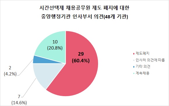 이에 대해 회신한 48개 기관 중 29개(60.4%) 기관이 ’제도 폐지‘를 희망하고 7개(14.2%) 기관이 ’인사혁신처 제도 개선 방안에 따르겠다’라고 응답했다.
