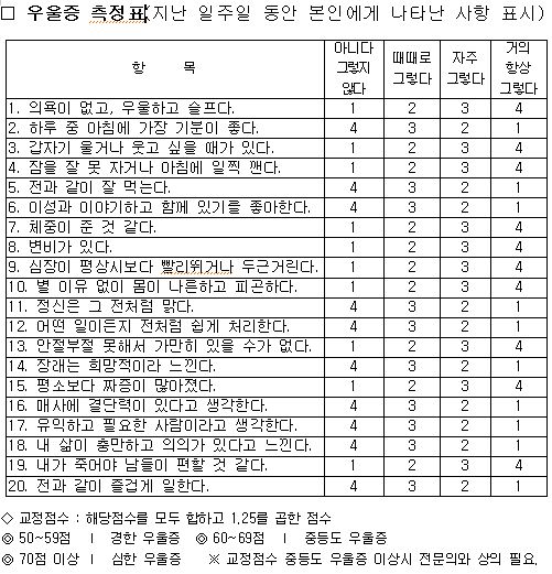 건강관리협회 관계자는 "정작 본인에게 우울증이 찾아와도 모르고 지나치는 경우가 많다"며 "우울증 자가측정을 통해 교정점수가 중등도 우울증 이상으로 나오면 전문의와 상의하는 것이 좋다"고 밝혔다.