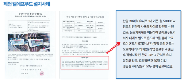 또한 제천시의 엘에프푸드 역시 실험을 통해 놀라운 결과를 확인했다. 동일한 냉동창고 2곳 중 한 곳에만 SRD 센서를 장착하고 1개월간 전력 소비량을 비교한 결과, 약 5,000kW의 차이가 발생했고, 이후 나머지 모든 냉동기에도 센서를 추가 설치했다.