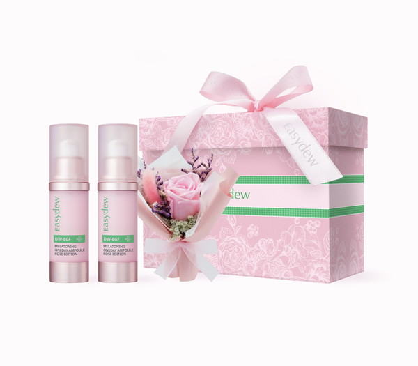 ‘기미 앰플(DW-EGF 멜라토닝 원데이 앰플) 로즈에디션’은 이지듀의 대표 제품 기미 앰플에 장미 유래 성분을 더하고, 장미를 연상시키는 분홍빛 패키지를 적용한 한정판 에디션이다. 이번 에디션은 프리저브드 플라워와 고급 선물 박스 세트로 구성돼 가정의 달 선물로 제격이다.