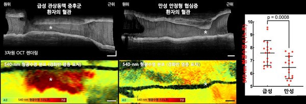 [뉴스인] 조진성 기자 = 고려대 구로병원 심혈관센터 김진원·카이스트 기계공학화 유홍기 교수팀(고려대 구로병원 심혈관센터 김진원, 강동오 교수 / 카이스트 기계공학과 유홍기, 남형수 교수 / 고려대 안산병원 김선원 교수)이 ‘광간섭 단층촬영(optical coherence tomography: OCT)과 형광수명영상(fluorenscence lifetime imaging: FLIm)을 결합한 최첨단 융합영상 시스템(OCT-FLIm)’를 개발하고, 이를 통해 인체 심장혈관 내 고위험 동맥경화반에 대한 고해상도 정밀 분자영상 진단의 유효성과 안전성을 입증하는 데 성공하는 쾌거를 이루었다.