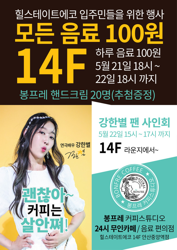 [뉴스인] 김태엽 기자 =안산 중앙역 인근 ‘힐스테이트에코’ 단지에 입점한 봉프레 커피스튜디오가 오는 21일 입주민을 위한 특별 행사를 개최한다고 15일 밝혔다.