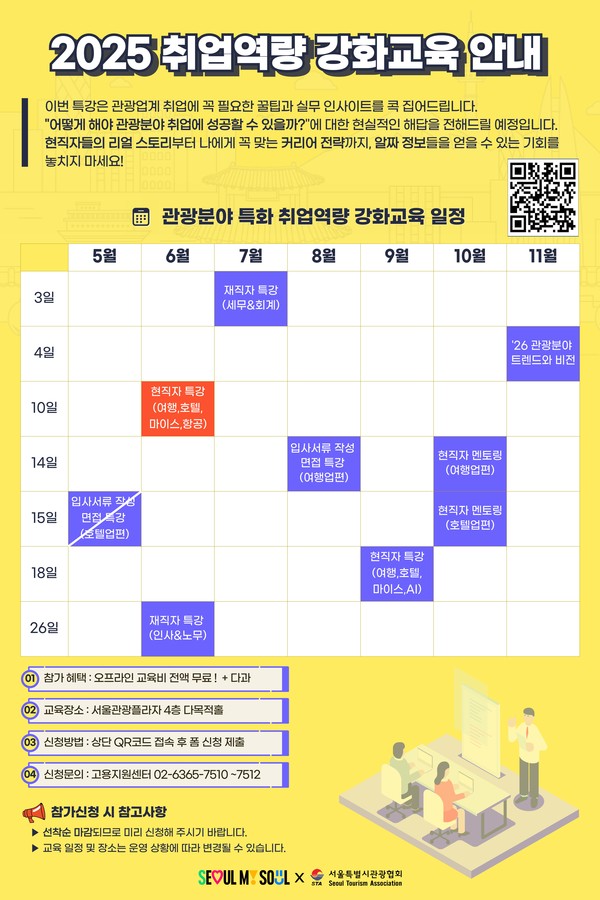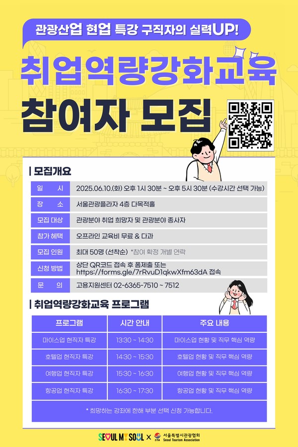 [뉴스인] 이재영 기자 = 서울특별시관광협회(회장 조태숙)에서 운영하는 서울관광고용지원센터는 오는 6월10일 관광산업 분야 취업을 준비하는 구직자들을 위한 ‘현직자 취업역량강화 특강’을 마련했다.