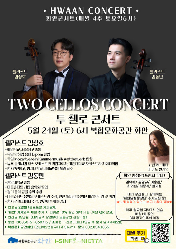 이번 5월의 '화안콘서트'에는 첼리스트 김상호, 김동민이 출연해 아름다운 첼로 듀오의 하모니를 선보일 예정이다. 완연한 봄기운이 느껴지는 5월 저녁, 두 첼리스트는 따뜻하고 매력적인 첼로의 선율로 관객과의 특별한 만남을 준비하고 있다.