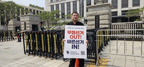 [뉴스인] 조진성 기자 = (사)바른선거시민모임중앙회 김명곤 회장이 28일 오전 11시 서울 종로구 헌법재판소 앞에서 ‘부정선거 OUT, 바른선거 IN’이라는 구호를 내건 1인 시위를 진행했다.