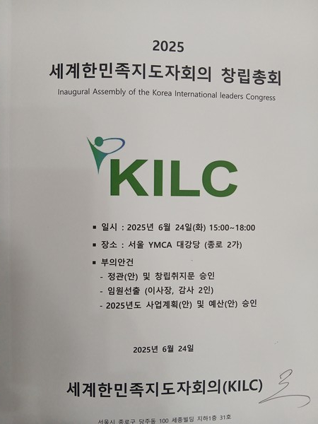 [뉴스인] 조진성 기자 = 세계한민족지도자회의(KILC, Korea International Leaders’ Congress)가 창립총회를 열고 정영국 박사를 초대 이사장으로 선출하며 본격적인 활동에 나섰다. KILC는 전 세계 한민족 리더들을 연결하고, 한류문화의 확산과 재외동포 정책 발전을 선도하겠다는 비전을 갖고 설립됐다.