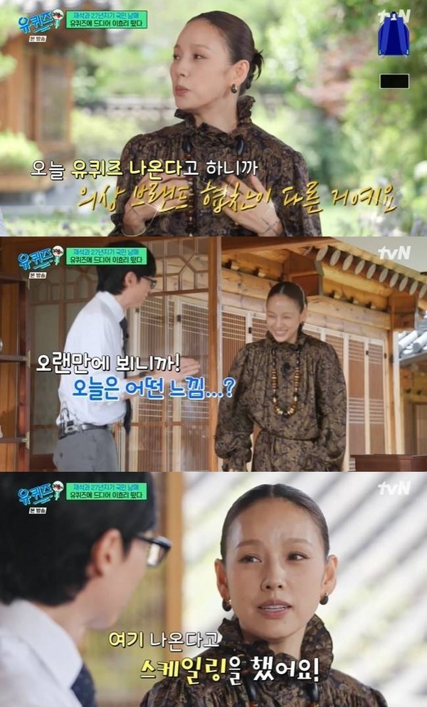 MC 유재석은 "그동안 이효리씨 다양한 모습을 봤지만, 이 모습은 처음"이라며 놀랐다. 이효리는 "올백하고 방송에 처음 나오는 것"이라며 "이마가 넓은 편이라서 젊었을 때는 머리를 올백하는 게 창피했다. 나이가 드니까 '뭐 어때?'라는 느낌이다. 메이크업 실장님이 점 찍는 걸 좋아한다. 얼굴이 예쁘면 매력이 떨어질 수 있으니까 약간 흉을 줬다. 오늘 유퀴즈라고 하나를 더 찍어줬다"고 설명했다.