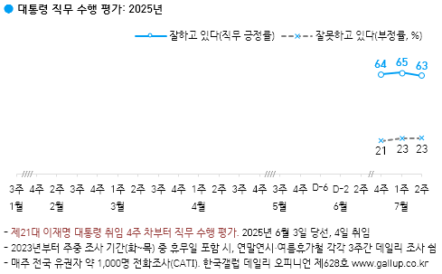 [뉴스인] 김태엽 기자 =한국갤럽이 2025년 7월 둘째 주(8~10일) 전국 만 18세 이상 유권자 1,002명에게 이재명 대통령이 현재 대통령으로서의 직무를 잘 수행하고 있다고 보는지 잘못 수행하고 있다고 보는지 물은 결과(2점 척도, 재질문 1회), 63%가 긍정 평가했고 23%는 부정 평가했다. 14%는 의견을 유보했다.