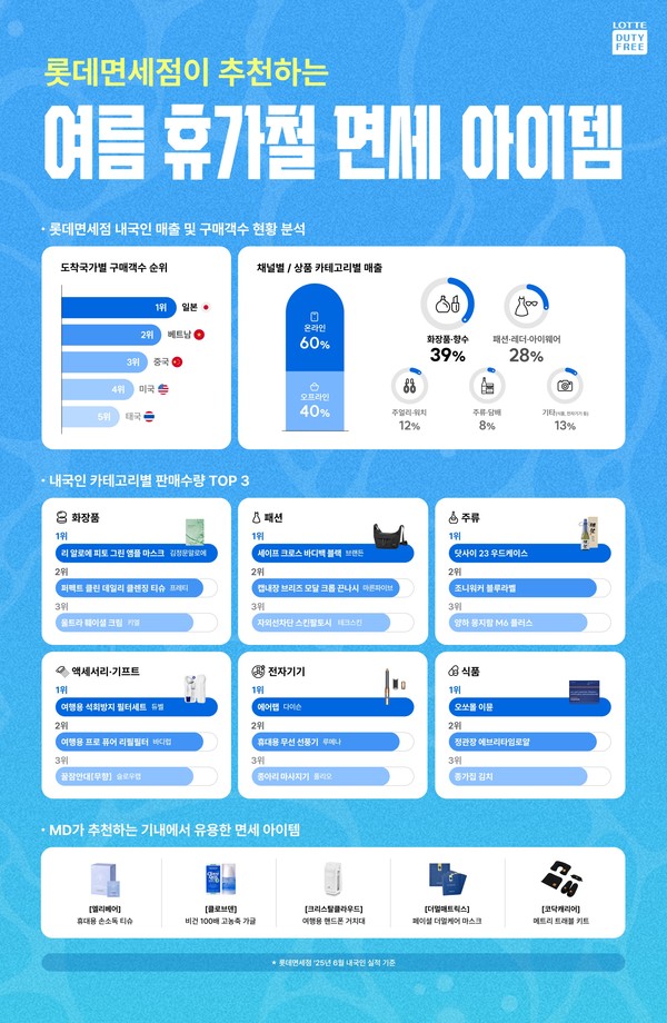 [뉴스인] 조진성 기자 = 본격적인 여름 휴가철을 맞이해 인기 여행지를 중심으로 해외여행 수요가 높아지고 있다. 국토교통부 항공정보포털시스템에 따르면 올해 6월 국가별 여객 수는 일본, 중국, 베트남, 미국, 대만 순으로 높았으며, 지난 6월 롯데면세점 내국인 고객의 도착국가별 구매고객수는 일본, 베트남, 중국, 미국, 태국 순이었다. 롯데면세점은 현재 일본, 베트남, 괌 등 해외 5개 국가에서 10개 매장을 운영하고 있으며, 해외여행을 준비하는 내국인 고객들을 위해 베스트 아이템부터 이색 용품까지 다양한 상품과 프로모션을 준비했다.
