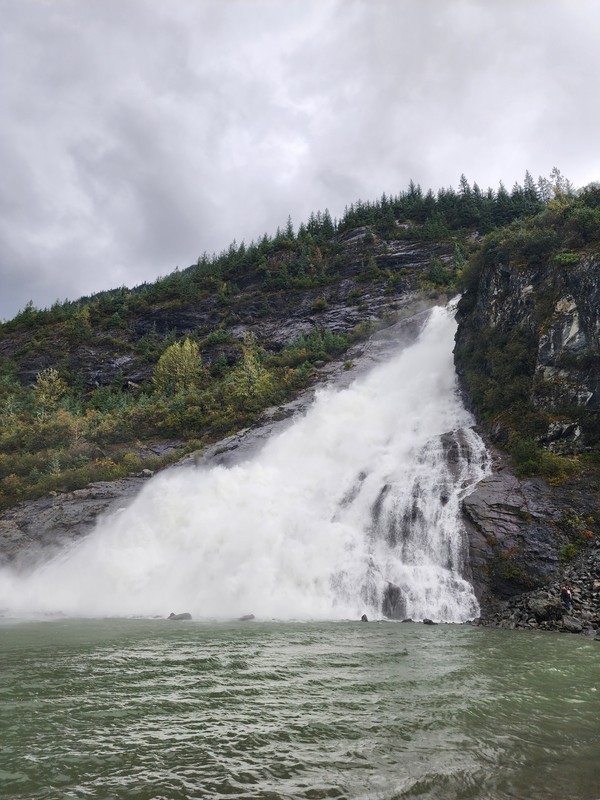 곧 이어 웅장한 너겟폭포의 모습이 시야에 들어왔다. 높이 115m의 너겟폭포는 빙하가 녹은 물로 만들어진 폭포라고 하는데, 최근 이 지역의 계속되는 비로 말미암아 수량이 어마어마하게 늘어난 모습이다. 폭포 바로 앞 멘덴홀 호수도 물이 넘쳐나고 있었다. 푸른 빛의 빙하 옆에 하얀 포말을 쏟아내는 폭포 그리고 잿빛 하늘, 자연이 연출해 낸 또 하나의 작품이다.