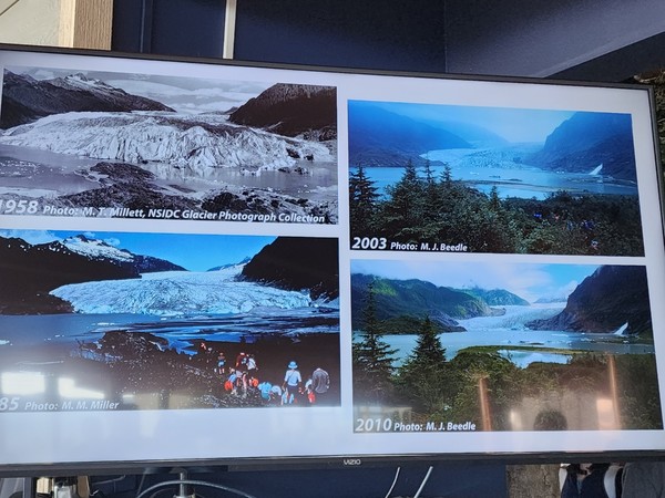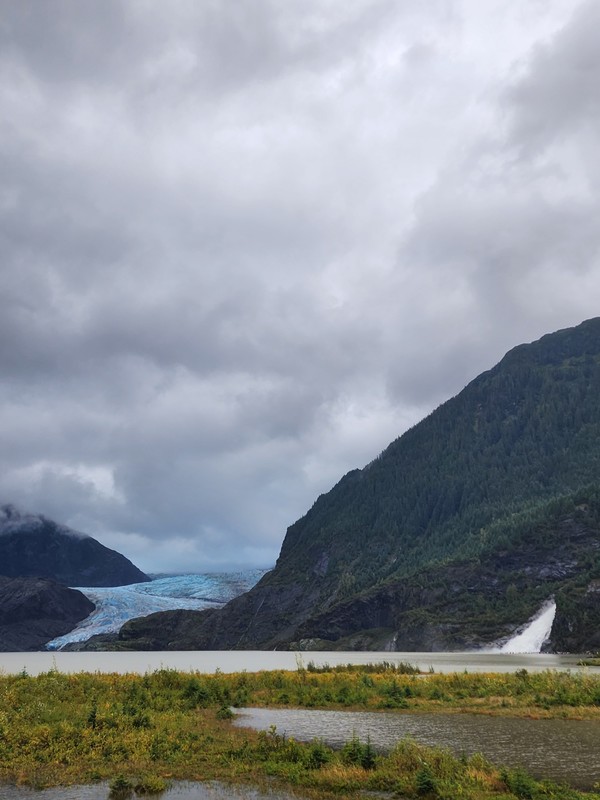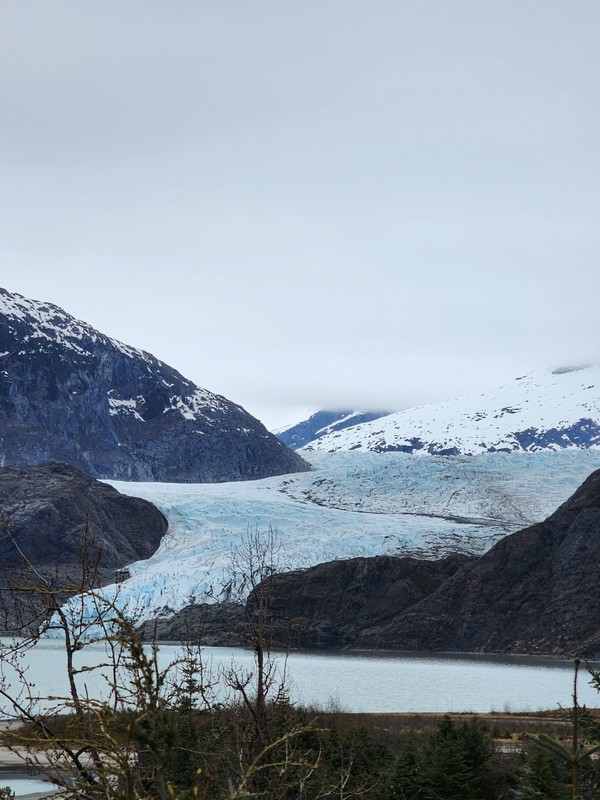 혼잡한 주노항구를 떠나 우리 일행이 향한 곳은 멘덴홀 빙하(Mendenhall Glacier)이다. 폭 2.3km, 길이 19km, 두께 93m의 알래스카의 대표적 빙하 중의 하나이다. 가장 접근성이 좋은 빙하이기에 대부분의 크루즈 승객들이 찾는 곳이다. 요즘 우리가 말하는 지구 온난화의 영향을 가장 잘 볼 수 있는 곳이기도 하다. 멘덴홀 빙하가 가장 컸었던 1767년 대비 현재의 빙하는 4km 정도가 뒤로 후퇴하였다고 한다. 이 속도로 녹는다면 다음 세기에는 소멸할 수도 있다고 한다.