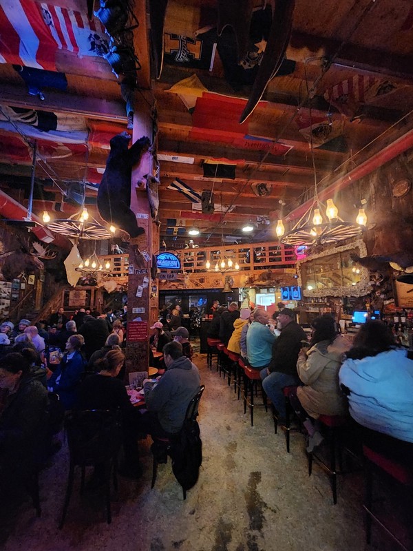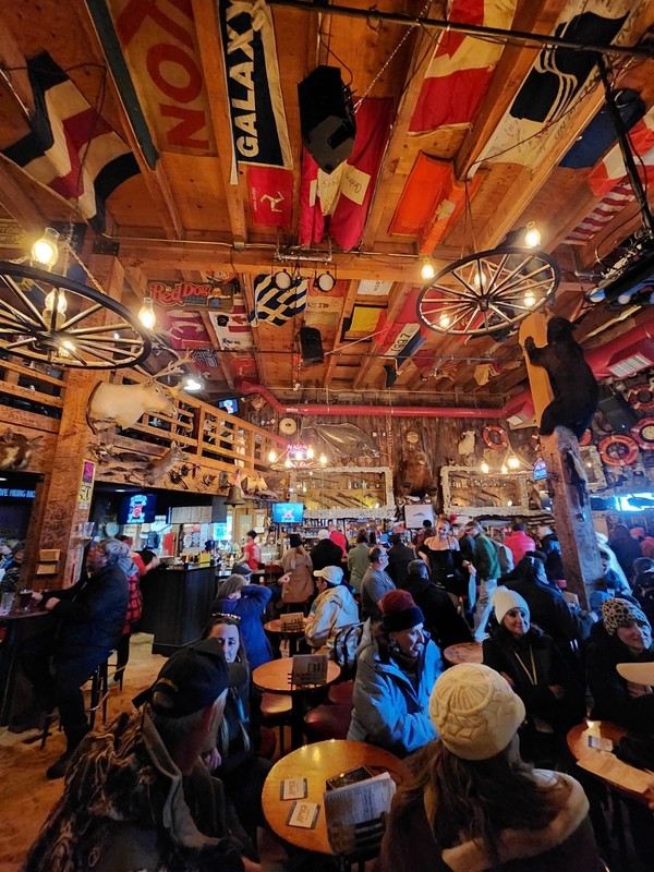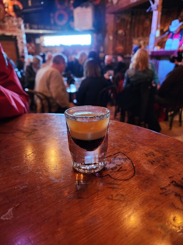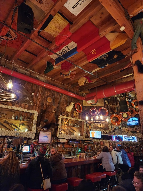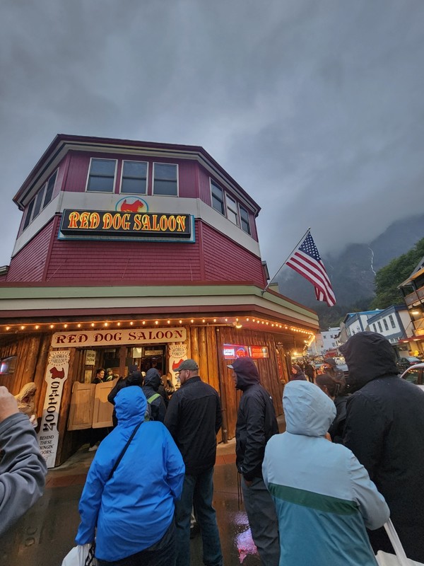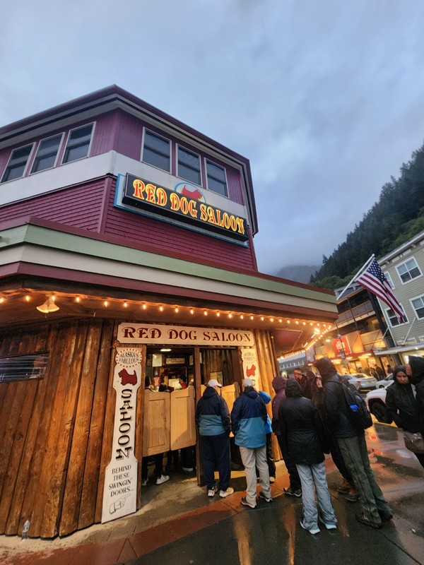 멘덴홀 빙하 투어를 마치고 다시 주노 시내로 돌아왔다. 여전히 비가 추적추적 내리고 있었다. 가장 먼저 주노의 명소 중의 하나인 레드 독 살롱(Red Dog Saloon)을 찾았다. 1880년대 골드러쉬 시절에 만들어진 선술집 모습을 지금까지 그대로 유지하고 있는 술집이다. 2021년 트립 어드바이저 기준 알래스카 전체 음식점 중에서 랭킹7위 안에 들어가는 집이라고 한다. 그렇다보니 이곳을 찾으려는 사람들이 이미 장사진을 치고 있었다. 살롱 밖으로 대기 줄이 길게 늘어서 있다. 이 곳에서는 알래스카의 전통술인 덕 파츠(Duck Fart) 한잔을 해야 제격이다. 비 오는 날 서부시대 선술집에서 알래스카 위스키를 폼잡고 마셔본다. 분위기 최고다 !
