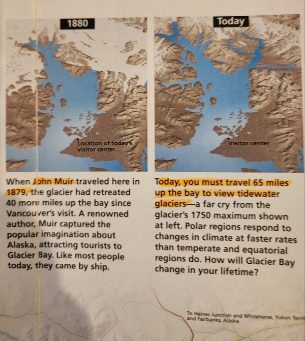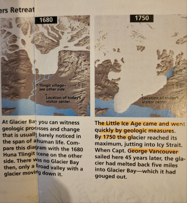 최근 들어 글레이셔 베이 국립공원이 인기있는 핫 플레이스로 자리잡은 이유는 가장 드라마틱하게 지구 온난화의 영향을 직접 눈으로 확인할 수 있는 곳이기 때문이로 보인다. 전문가들의 연구에 의하면 글레이셔 베이에 빙하가 가장 크게 확장된 시점은 1750년대로 추정하고 있다. 그로부터 45년후인 1794년에 조지 벤쿠버(George Vancouver)선장이 방문하여 글레이셔 베이 빙하의 최초 크기를 확인했다고 한다.