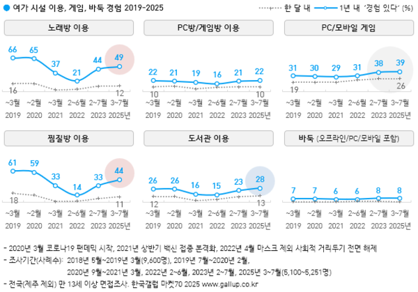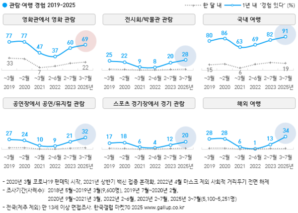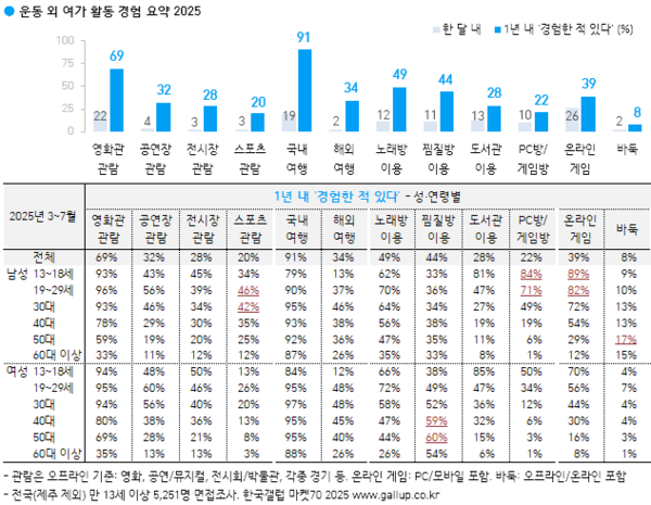 [뉴스인] 김태엽 기자 =한국갤럽이 2025년 3월부터 7월까지 전국(제주 제외) 만 13세 이상 5,251명에게 운동 외 여가 활동 12종 각각의 경험을 물었다. 그 결과를 최근 1년 내 경험(이하 '연간 경험률') 기준으로 보면 국내여행 91%, 영화관 관람 69%, 노래방 이용 49%, 찜질방 이용 44%, PC/모바일(이하 '온라인') 게임 39%, 해외여행 34%, 공연장/뮤지컬 관람 32%, 전시회/박물관 관람, 도서관 이용 각각 28%, PC방/게임방 이용 22%, 스포츠 경기장 관람 20%, 바둑(온라인 포함) 8% 순으로 나타났다.