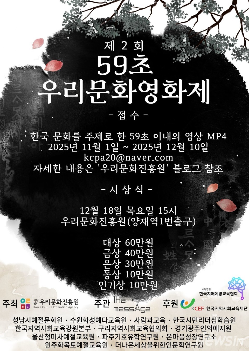 [뉴스인] 이용섭 기자 = 사단법인 우리문화진흥원이 주최하고 영상제작사 더메시지가 주관하는 ‘제2회 59초 우리문화영화제’가 오는 12월 18일 오후 3시 서울 서초구 KCEF 서초플랫폼에서 개최된다.