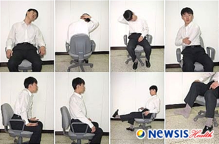 좌석에 편안히 않은 자세에서 배와 허리를 앞으로 내밀며, 척추를 곧추세우고, 허리에 5초간 힘껏 힘을 준다. 허리가 쭉 펴지는 것을 느낄 수 있다.