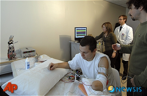 2일(현지시각) 이탈리아 로마에서 열린 한 기자회견장. 이날 회견을 주최한 유럽 과학자들은 3년 전 교통사고로 왼쪽 팔을 잃은 피에로파올로 페트루치에(26)가 지난해 1달 동안 인공 팔을 자신의 의지대로 움직이는 모습이 담긴 동영상을 상영했다.