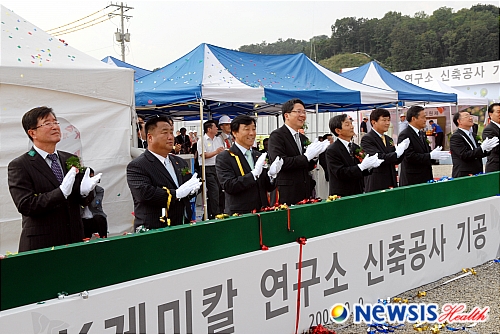 9일 SK케미칼 연구소 신축 기공식 현장에서 최창원 SK케미칼 부회장(좌에서 네번째), 김창근 SK케미칼 부회장(좌에서 세번째), 손관호 SK건설 부회장(좌에서 다섯번째)이 공사의 시작을 알리는 발파 후 박수를 치고 있다.