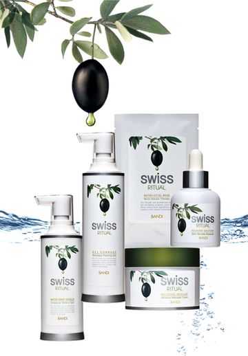 스위스 리츄얼은 각질관리를 해주는 '젤 고마쥬'와 앰플 단계에 사용하는 '리커버리 솔루션', '뉴트로 바이탈 마스크', '리파이닝 마사쥬', 마무리 단계에 피부 수분 보호막을 형성해주는 '워터 드롭 쉴드' 등의 단계로 나뉜다.