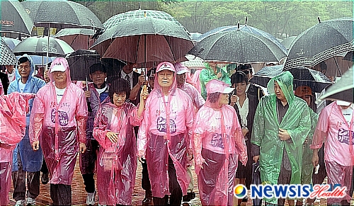 '88 서울올림픽 20주년 기념 국민화합 걷기축제'가 열린 20일 오후 서울 송파구 올림픽공원에서 세계 걷기운동본부 박세직 위원장을 비롯한 인사들이 가을비를 맞으며 공원을 걷고 있다. /홍찬선기자 mania@newsis.com