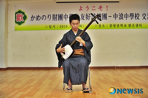 이날 중랑중학교에서 샤미센 연주 실력을 뽐낸 코이치군은 한국의 학생들에게 뜨거운 박수갈채를 받았다. 또 다른 일본 학생들도 각자 오키나와 전통무용과 검도 등을 선보이면서 일본문화 전도사 역할을 톡톡히 했다.