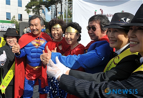 27일 오전 서울 인사동 남인사마당 야외무대에서 고령자 고용촉진 캠페인 Working60+을 알리는 홍보활동을 진행했다. 할아버지 슈퍼맨과 할머니 원더우먼이 등장해 밝고 힘찬 모습으로 캠페인을 알렸다. 노동부가 주최한 이번 행사는 이색적인 모습으로 등장한 실버모델들이 노인들도 일할수 있다는 것을 몸소 보여줌으로써 많은 눈길을 끌었다.