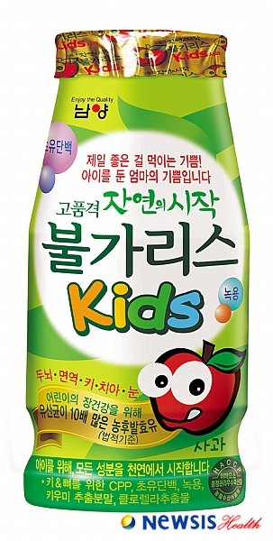 【서울=뉴시스헬스】조진성 기자 = 남양유업은 어린이 농후발효유 '불가리스Kids'를 출시했다고 29일 밝혔다. 이 제품은 인공원료를 전혀 사용하지 않고 100% 천연소재에서 추출한 원료만을 사용한 어린이 전용 드링크 발효유다. 또한 일반 발효유보다 10배나 많은 유산균을 포함하고 있어 장건강과 유아 성장에 도움을 준다. 남양유업 관계자는 "브랜드 확장을 통해 어린이도 '불가리스 장건강 프로그램'에 동참할 수 있도록 했다"고 밝혔다.