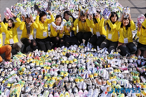 29일 서울 청계광장에서 운동화에 희망의 메세지를 담아 방글라데시로 보내는 하이원과 함께하는 2008희망의 운동화 나눔 축제에서 '희망의 운동화'가 전시되고 있다. 5일간 열리는 이번 전시회는 '2008 희망대사'들과 유명인사들이 사인한 운동화 외에 서울 및 강원 지역의 청소년과 시민들이 직접 그림을 그려넣은 운동화 4000여족이 전시된다.