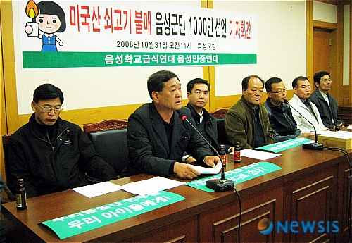31일 충북 음성군청 상황실에서 열린 '미국산 쇠고기 불매 음성군민 1000인 선언' 기자회견에서 현상봉 음성군학교운영위원장협의회장(왼쪽 두 번째)이 미국산 쇠고기 학교급식에 반대하고 있다.