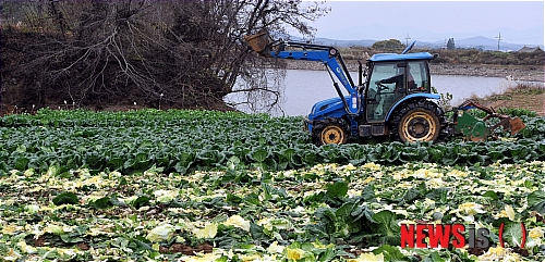 【광주=뉴시스】류형근 기자 = 배추값 급락으로 배, 무추 산지폐기가 진행되고 있는 가운데 17일 오전 전남 나주시 봉황면 철천리 정욱균(43)씨의 배추밭이 갈아 엎어지고 있다. hgryu77@newsis.com