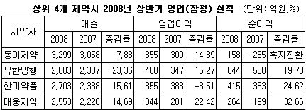 최근 동아제약, 유한양행, 한미약품, 대웅제약 등 상위 4개 제약사의 영업(잠정)실적에 따르면 동아제약이 올 상반기 전년대비 7.88% 증가한 3299억 원으로 1위 자리를 고수한 가운데 유한양행이 23.36% 성장한 2883억 원으로 2위 자리에 복귀했다.