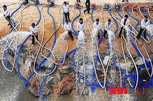 【서울=뉴시스】강진형 기자 = 6일 오전 서울 노원구 상계동 당현천에서 집중호우대비 수방담당 직원 및 직능단체 회원들이 여름철 홍수 대비 양수기 작동 훈련을 실시 하고 있다. 이번 훈련은 집중 호우 시 '당현천' 및 '중랑천'의 범람 등의 상황을 고려하여 시간당 300톤의 물을 끌어올릴 수 있는 5마력 양수기 25대를 동원해 당현천 물을 끌어올렸다. marrymero@newsis.com