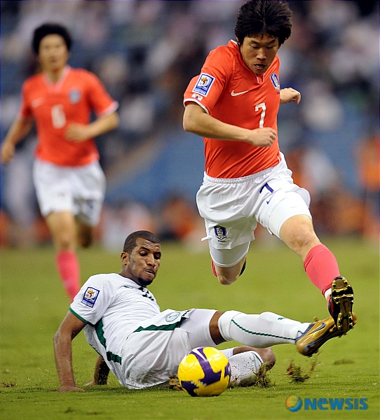 19일 오후(현지시간) 리야드의 킹 파드 국제경기장에서 열린 2010 남아공월드컵 아시아지역 최종예선 B조 3차전 한국 대 사우디아라비아 경기에서 박지성(한국)이 fallatah(사우디)의 태클을 피해 돌파를 시도하고 있다.