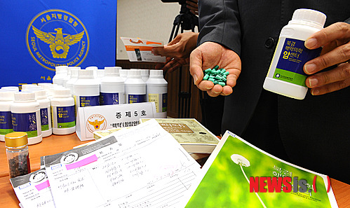 【서울=뉴시스】조종원 기자 = 2일 오전 서울 아현동 마포경찰서에서 송경호 국제범죄수사1대 수사팀장이 말기 암환자들에게 20억원대 가짜 암치료제를 판매한 무허가 중의사 검거 관련 브리핑 후 증거물들을 공개하고 있다. 중국 북경의 한 병원에 무허가 암센터를 차려놓고 인터넷 사이트를 통해 암치료에 획기적인 '핵약'을 개발했다고 광고했으며 국내 암환자 159명을 상대로 진료를 해주고 이 중 112명에게는 무허가 암치료제인 '핵약'을 판매하는 수법으로 약 22억원을 편취한 무허가 중의사 등 일당 4명을 검거했다고 전했다.