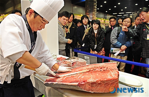 21일 코엑스에서 열리고 있는 '푸드위크(Food Week) 2008'를 찾은 관람객들이 인도양홀 사조그룹 부스에서 성인의 키만한 통 참치를 해체하는 모습을 관심있게 지켜보고 있다.