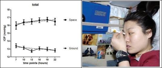 반면 무중력 상태인 우주에서는 평균 26% 안압의 상승이 8일간 지속됐고(평균 16.5mmHg), 아침보다 오히려 저녁 안압이 높은 패턴을 보이는 것으로 나타났다.