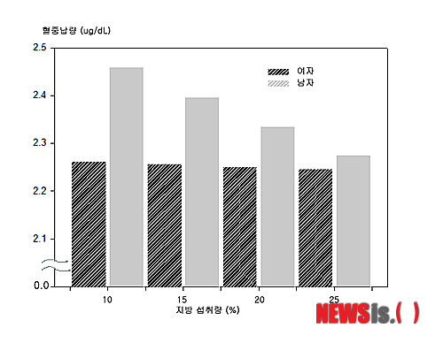 연구팀의 조사자료 분석에 의하면 우리나라 남자의 경우 일일 지방섭취가 20∼25%인 사람이 10%인 저지방 섭취군과 비교해 혈액중의 납농도가 5.3∼8.0% 감소했다.
