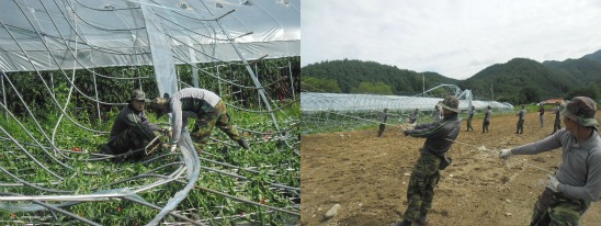 이날 사령부 소속 장병들은 강력한 바람으로 어지러워진 농가를 정리한 후 비닐하우스 파이프를 철거하고 농작물을 일으켜 세우는 작업을 진행했다.