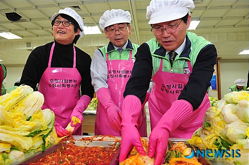 27일 오후 서울 광화문우체국 대강당에서 열린 우정사업본부 전국 쉼터보호 아동을 위한 사랑의 김장나누기행사에서 정경원 우정사업 본부장(가운데), 김현태 보험사업단장(오른쪽)이 홍보대사 가수 김현철과 함께 김장을 담그고 있다.