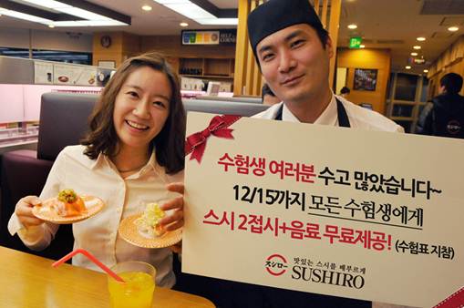 이번 이벤트는 2013학년도 수능에 응시한 수험생 모두에게 적용되며, 수험표를 지참하고 방문하면 메뉴에 관계없이 원하는 스시 두 접시와 에이드 한 잔을 무료로 제공한다.